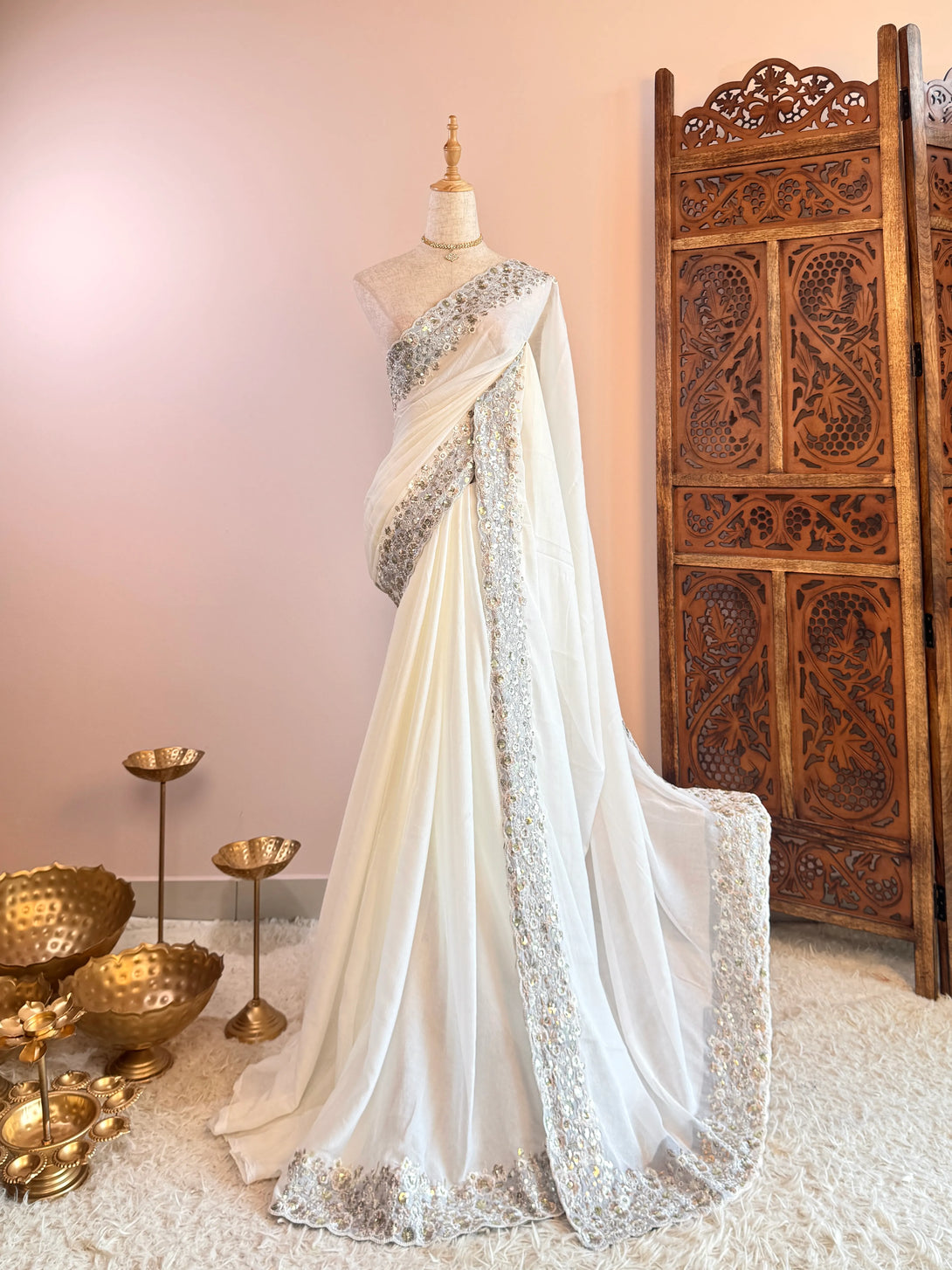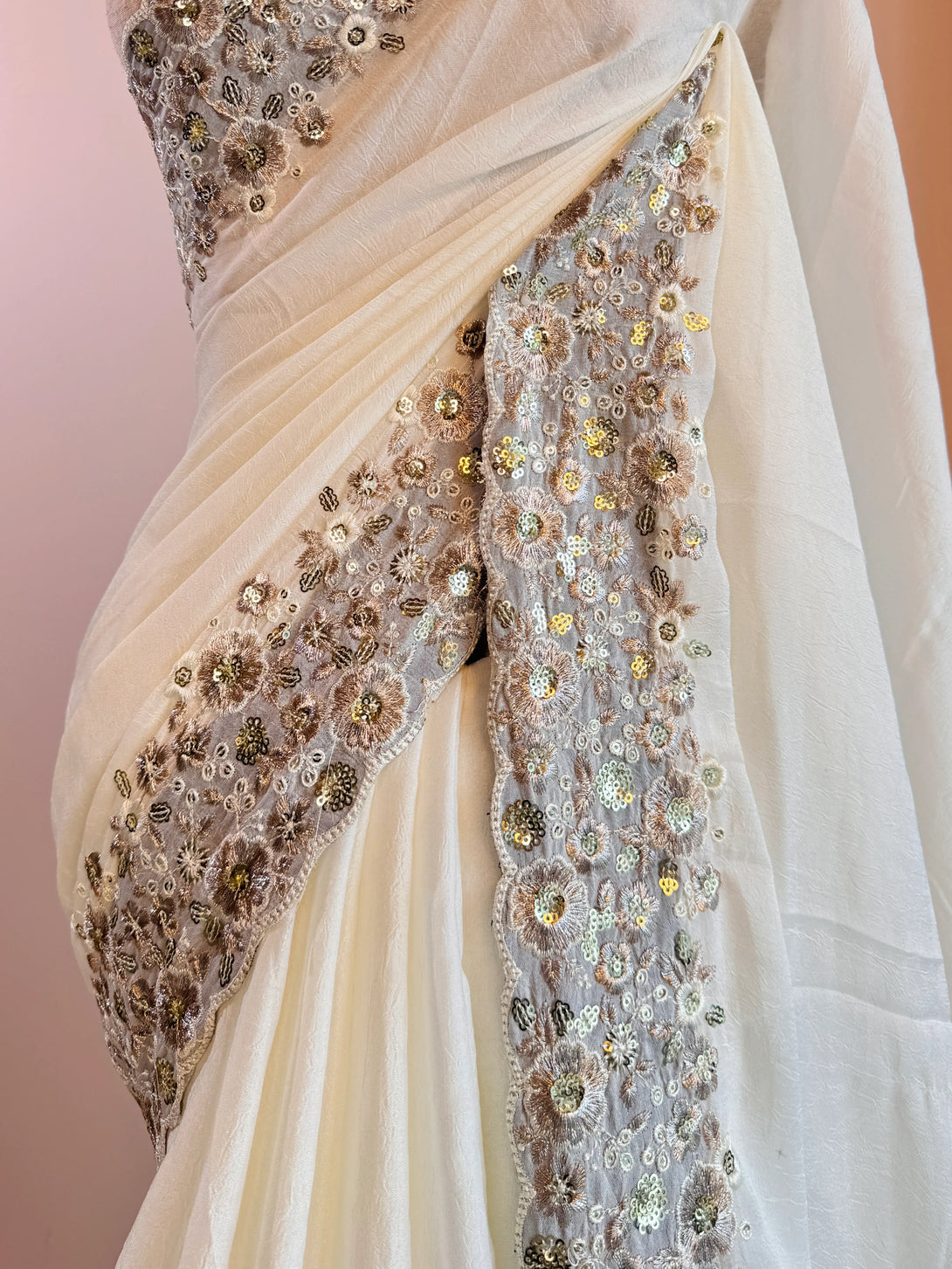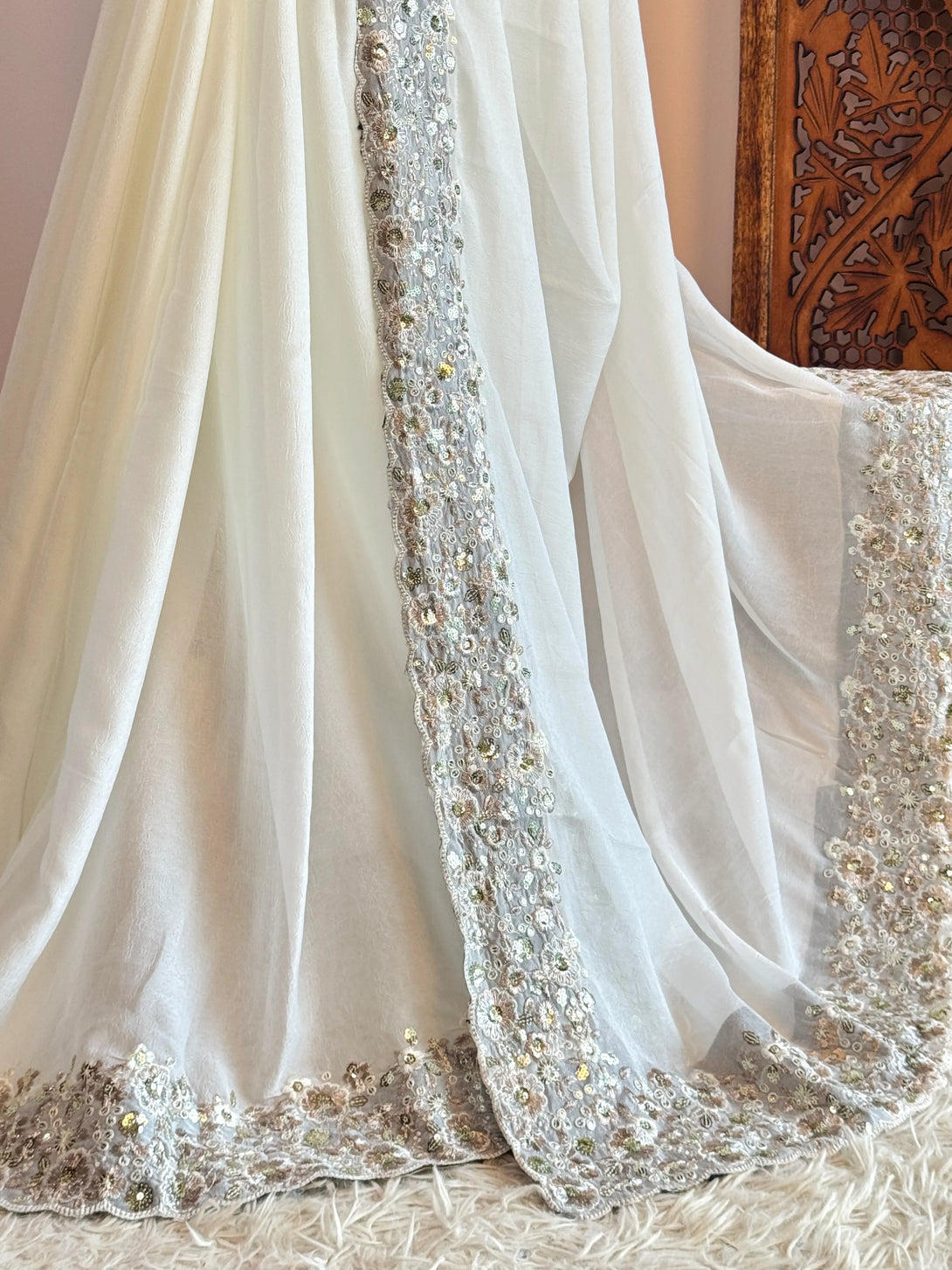 White Crepe-Silk Sequin-Floral-Embroidered North-Saree