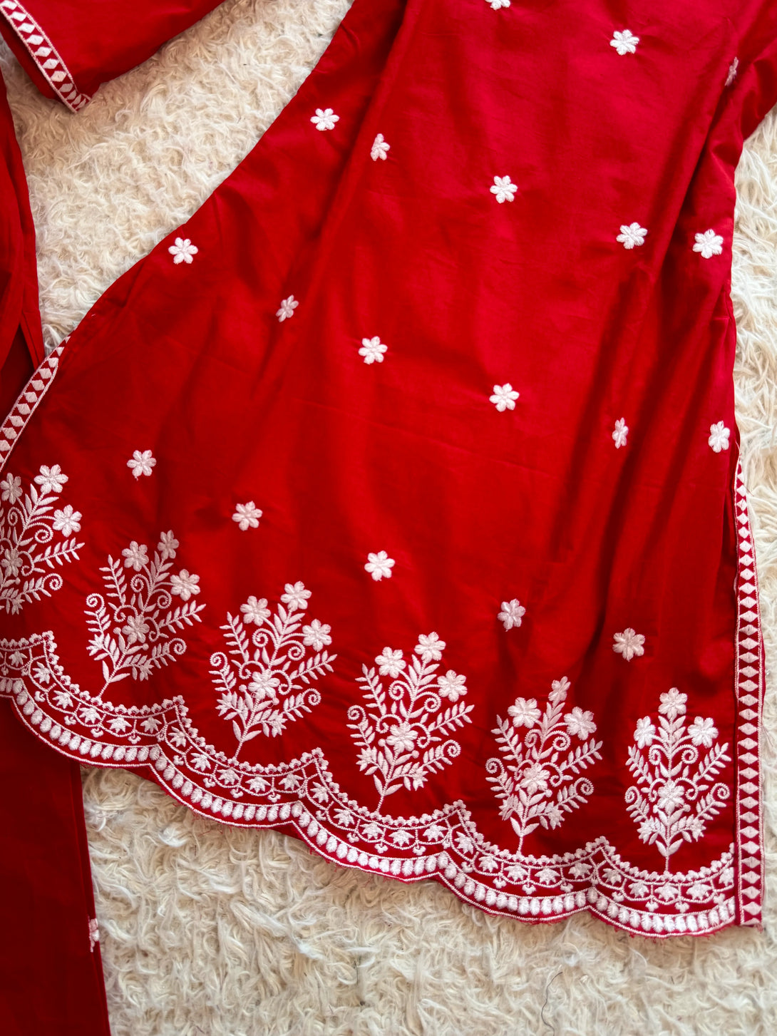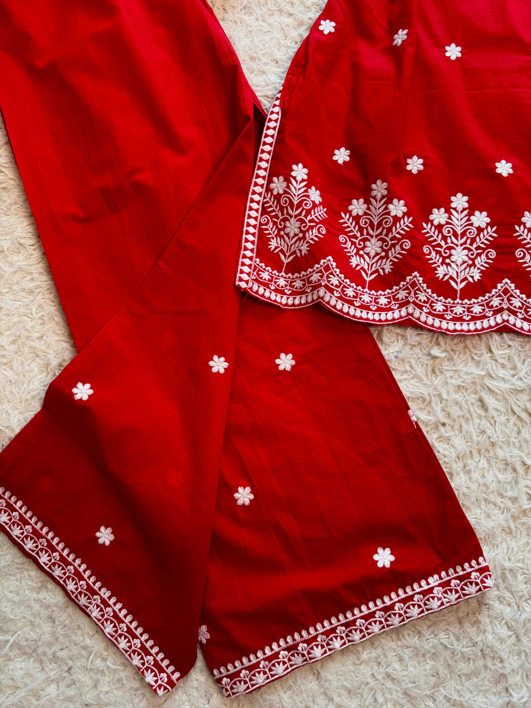Chilli-Red-White Pure-Cotton Kurti-Pant-Set