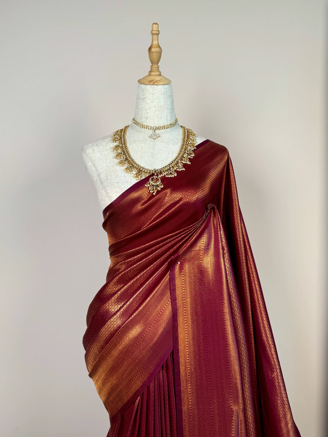 -Product Name: Maroon Soft-Silk Zari-Woven Banarasi-Saree