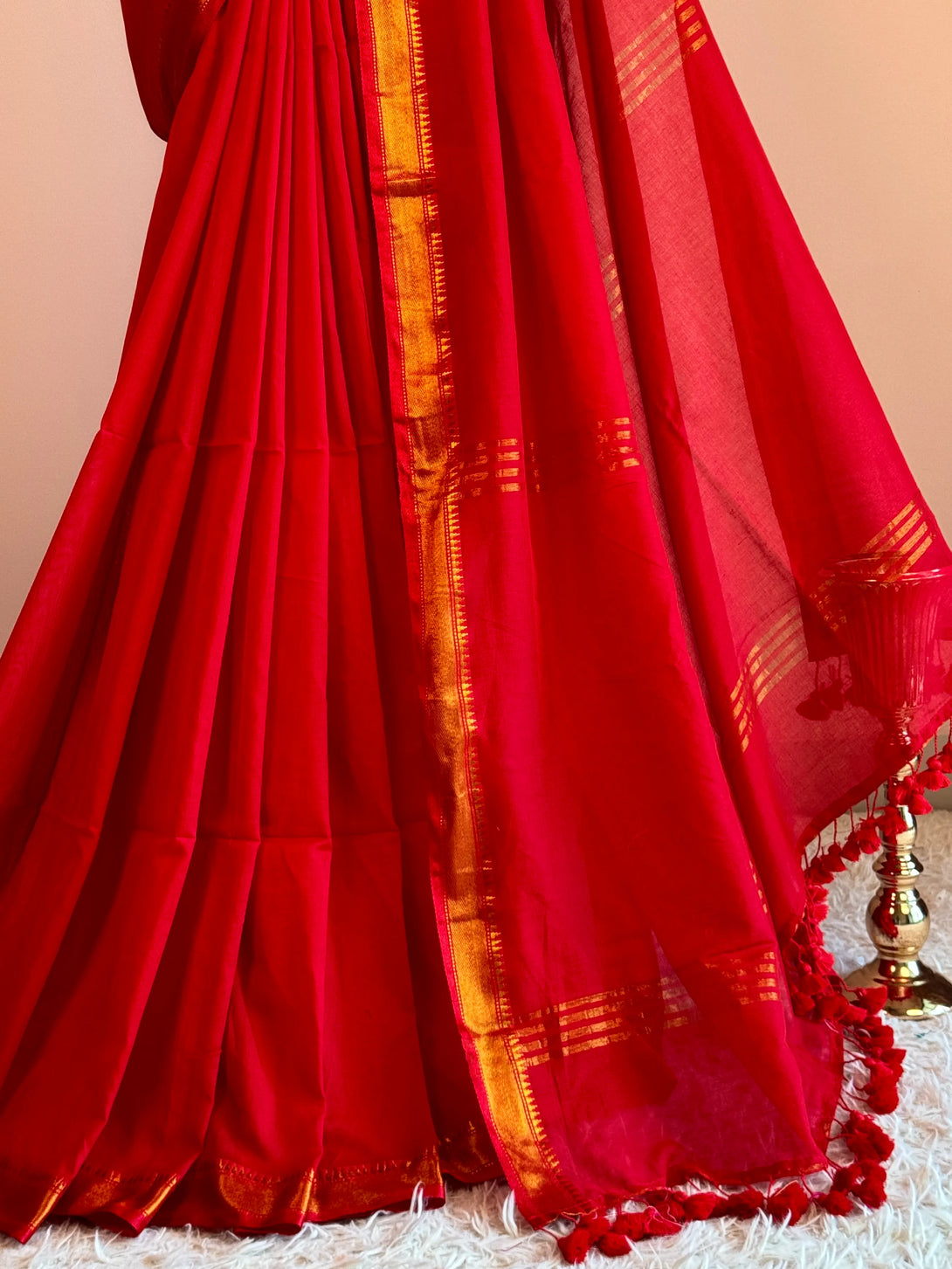 Chilli-Red Handspun Pure-Cotton Woven-Border Bengal-Saree
