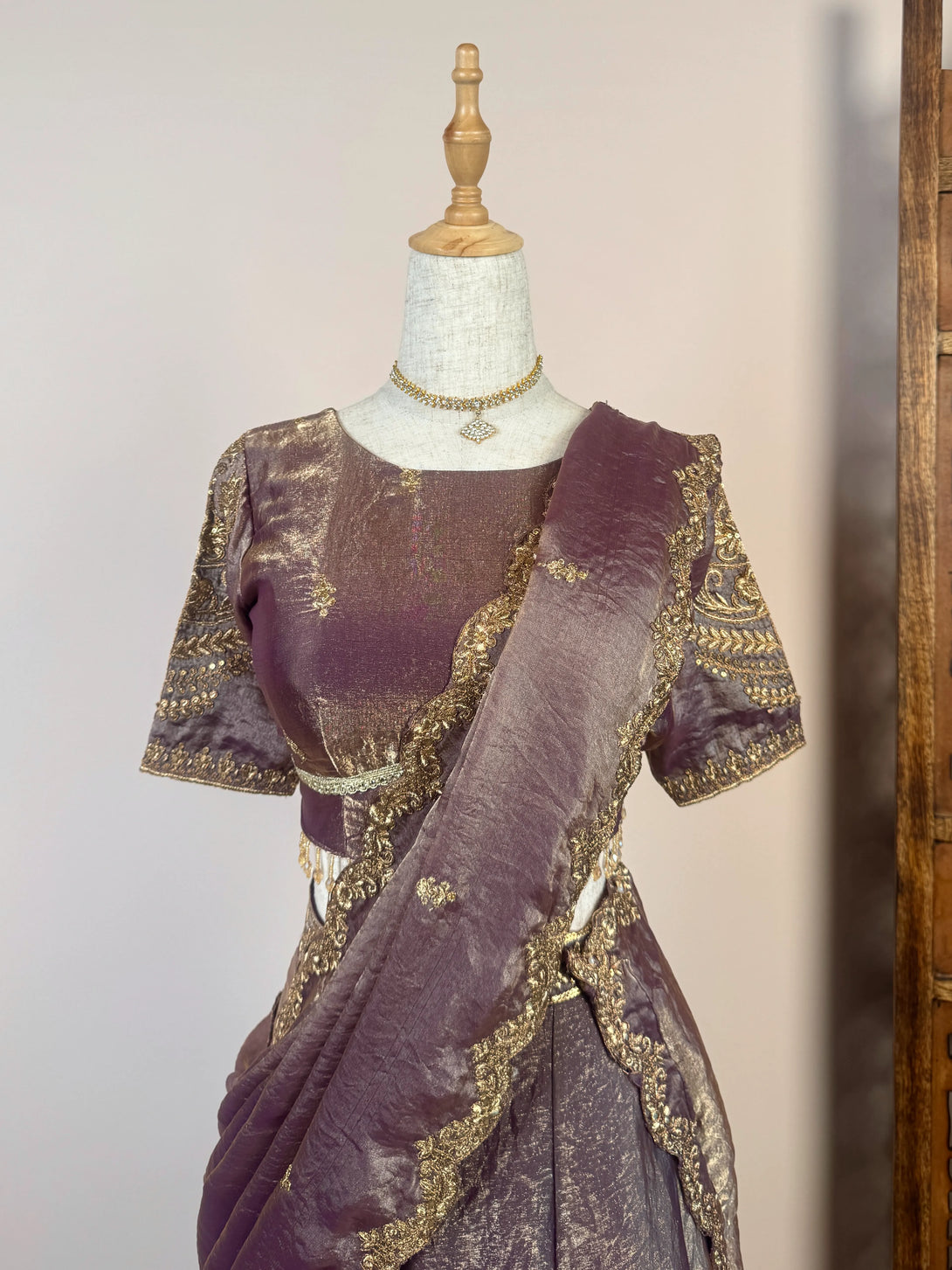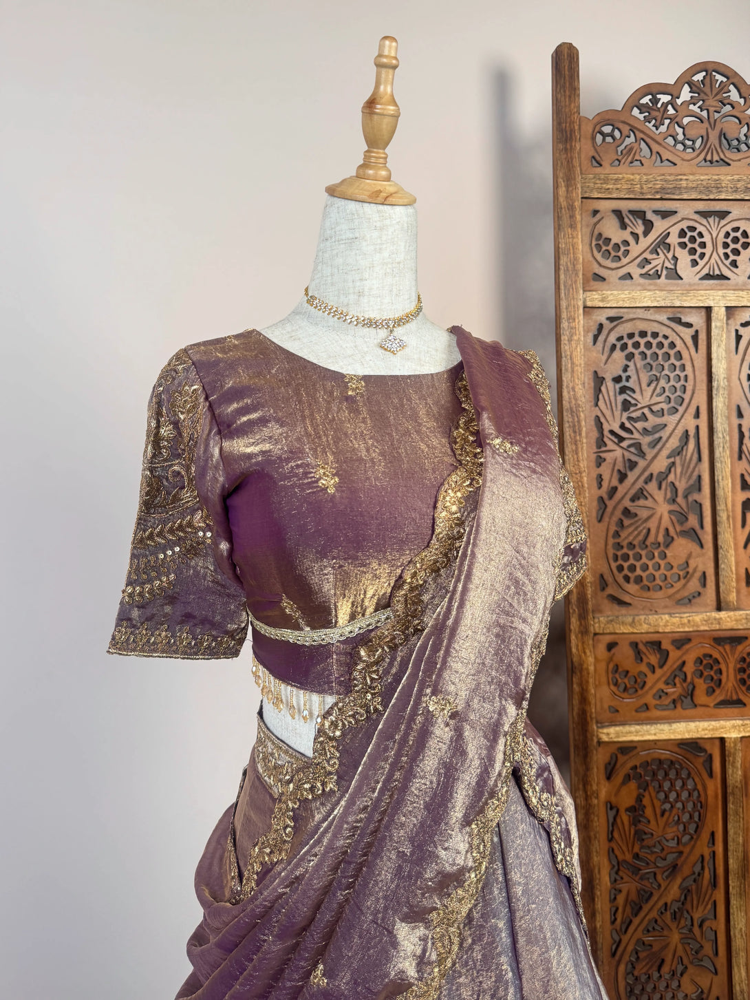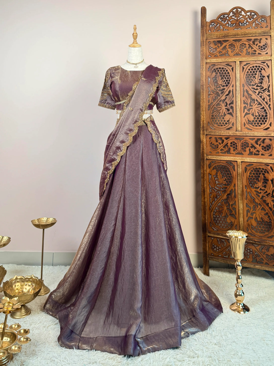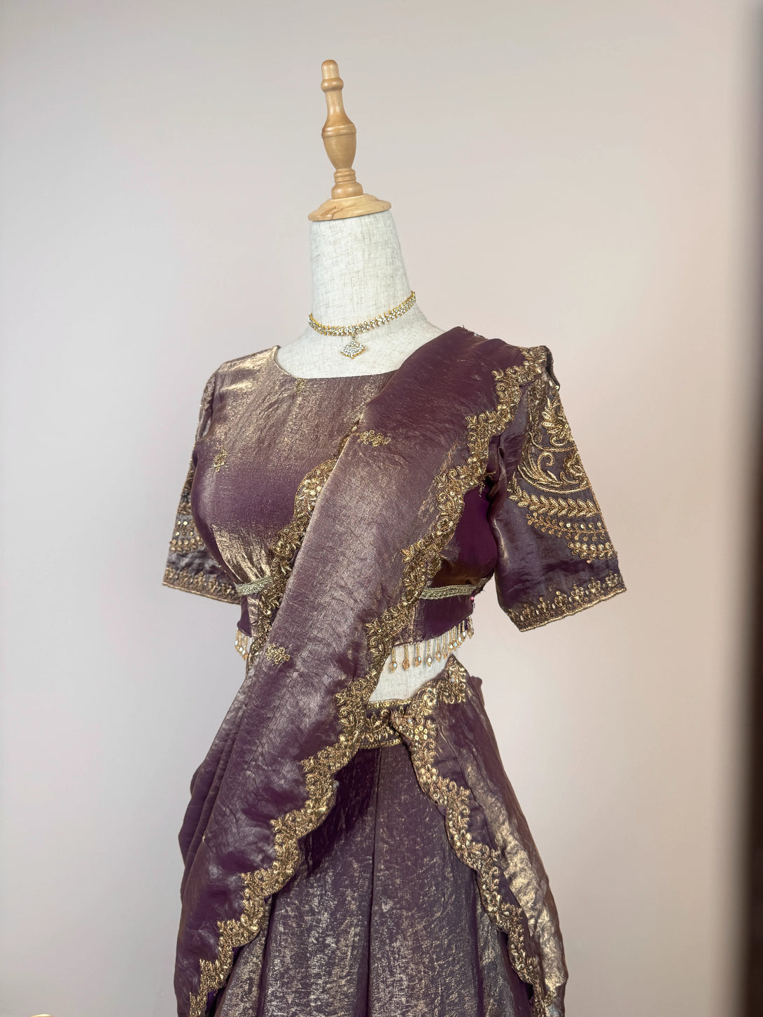 Dual-Toned-Purple Crushed-Silk Glossy-Finish Flowy-Flare Grand-Blouse-Lehenga-Skirt-Dupatta-Set