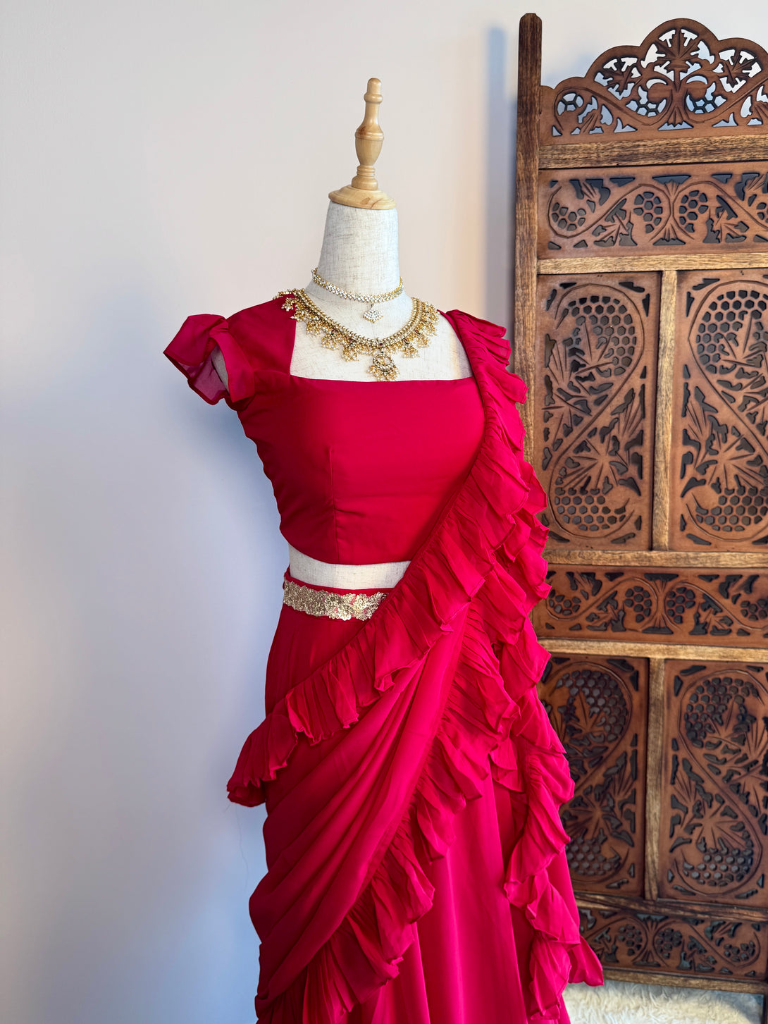 -Type: Cherry-Pink Silken-Georgette Pleated-Lehenga-Blouse-Ruffle-Dupatta-Set