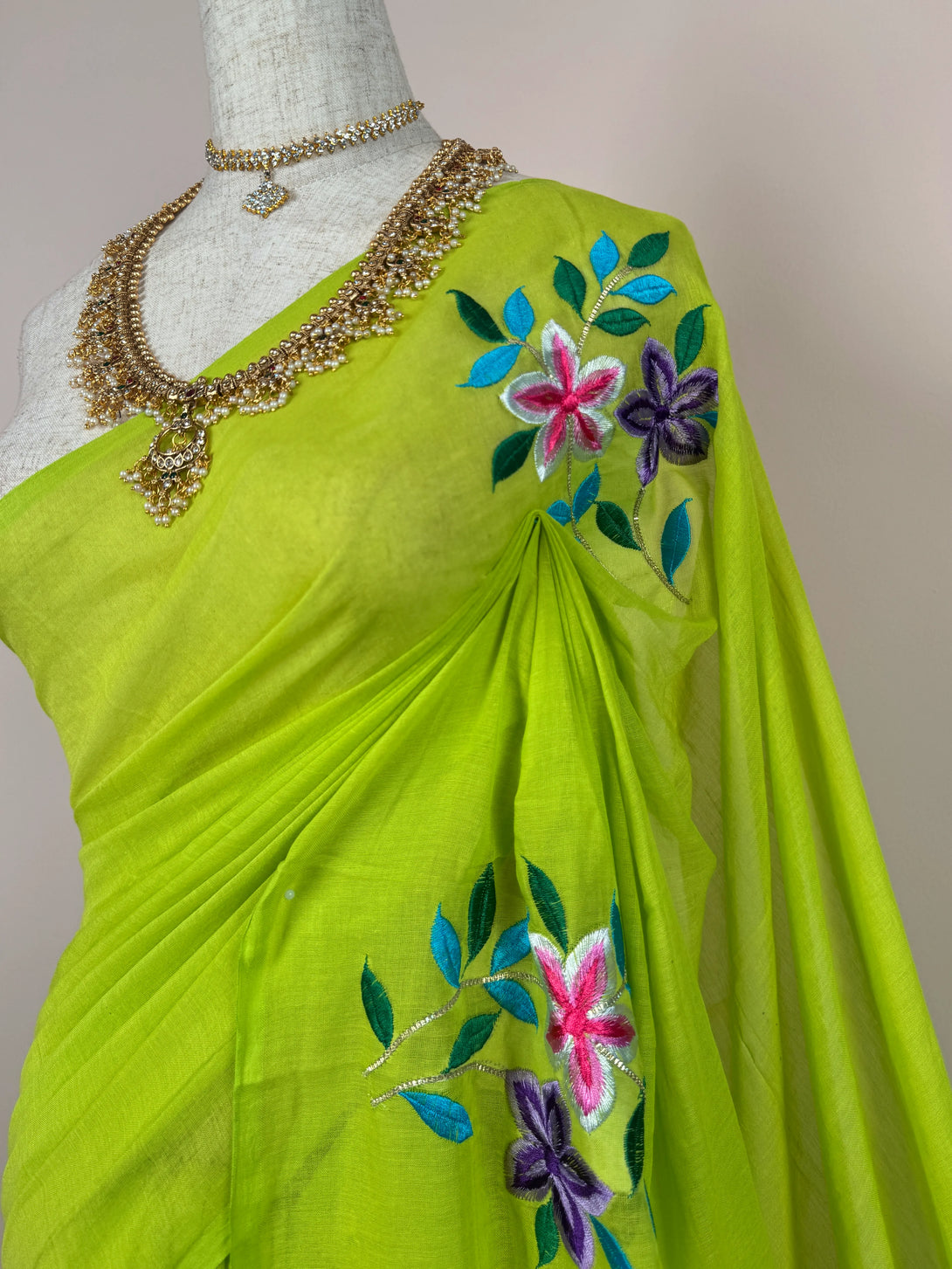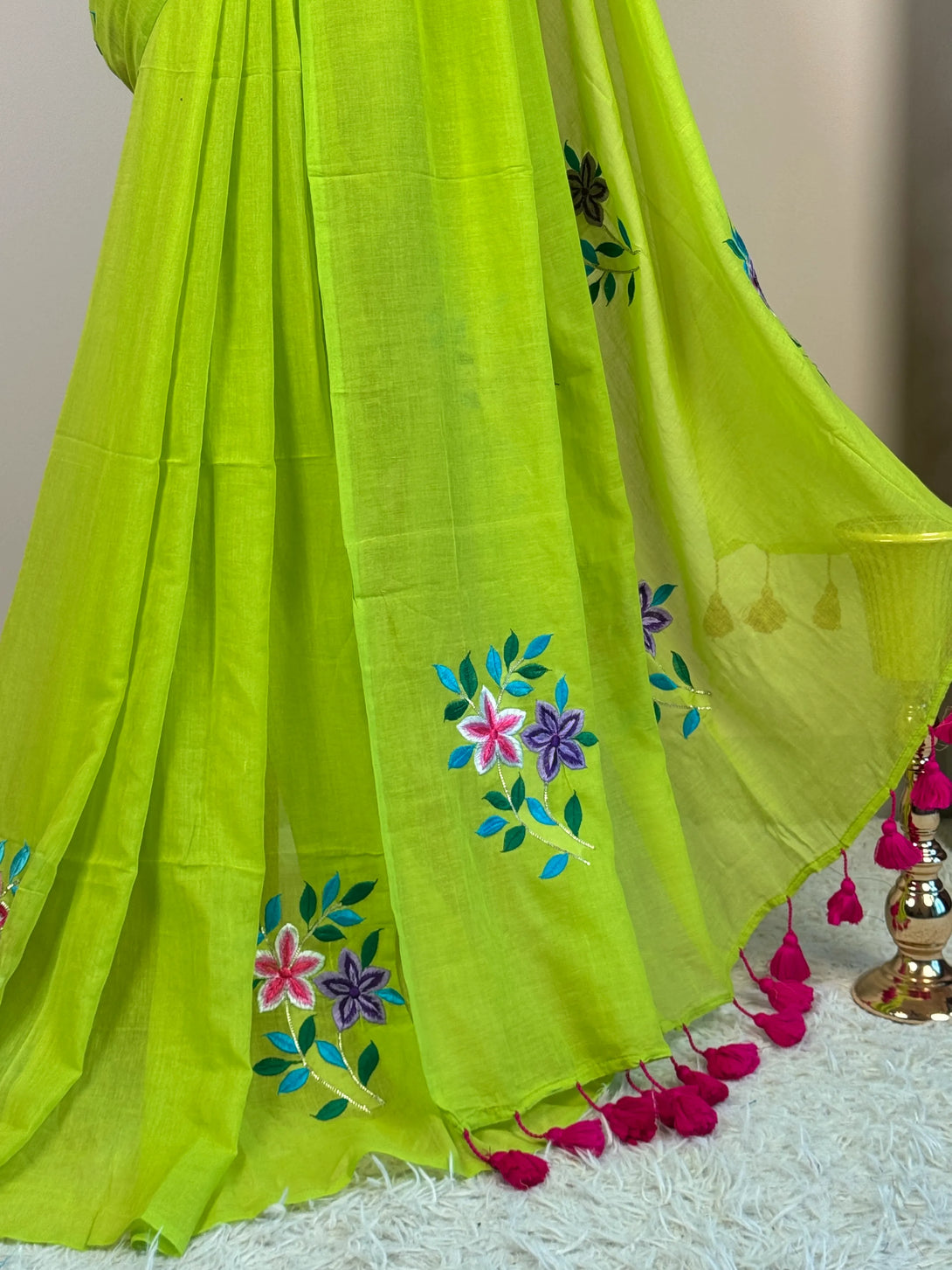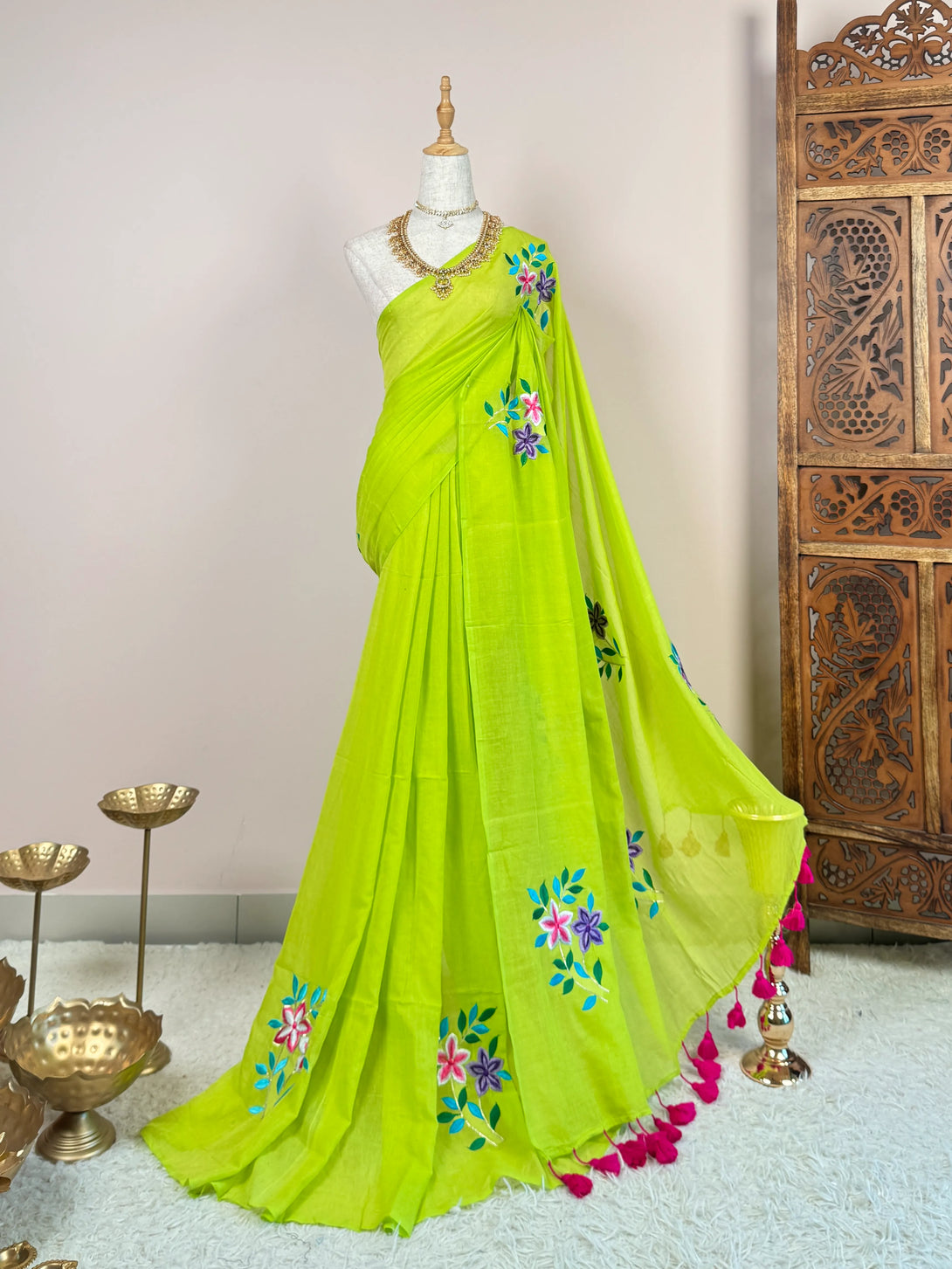 Apple-Green Pure-Cotton Thick-Floral-Embroidery Butta-Bengal-Saree