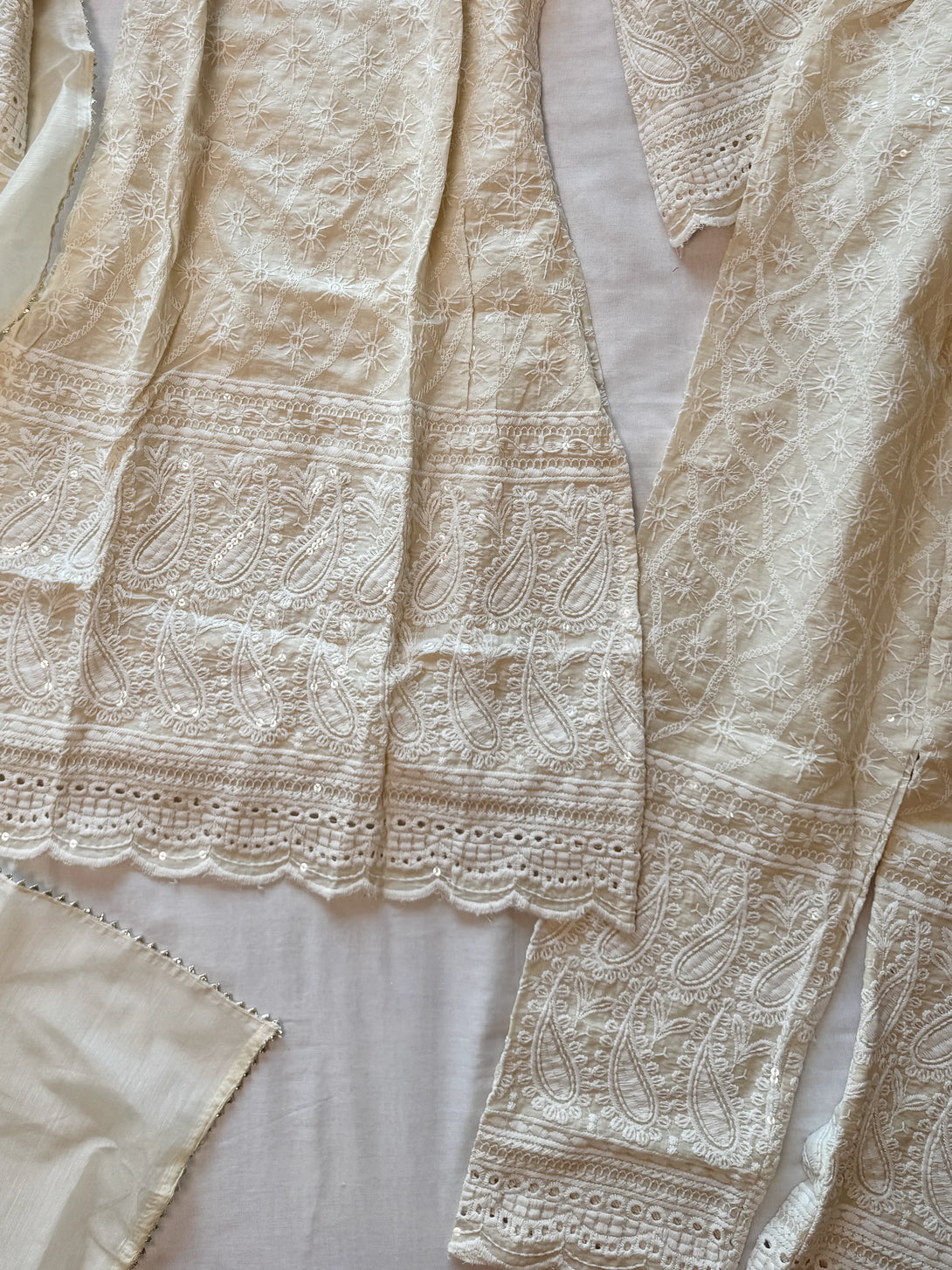 -Product Name: Off-White Chikan-Embroidered-Set with Pencil-Cut-Pants-Kurti-Set