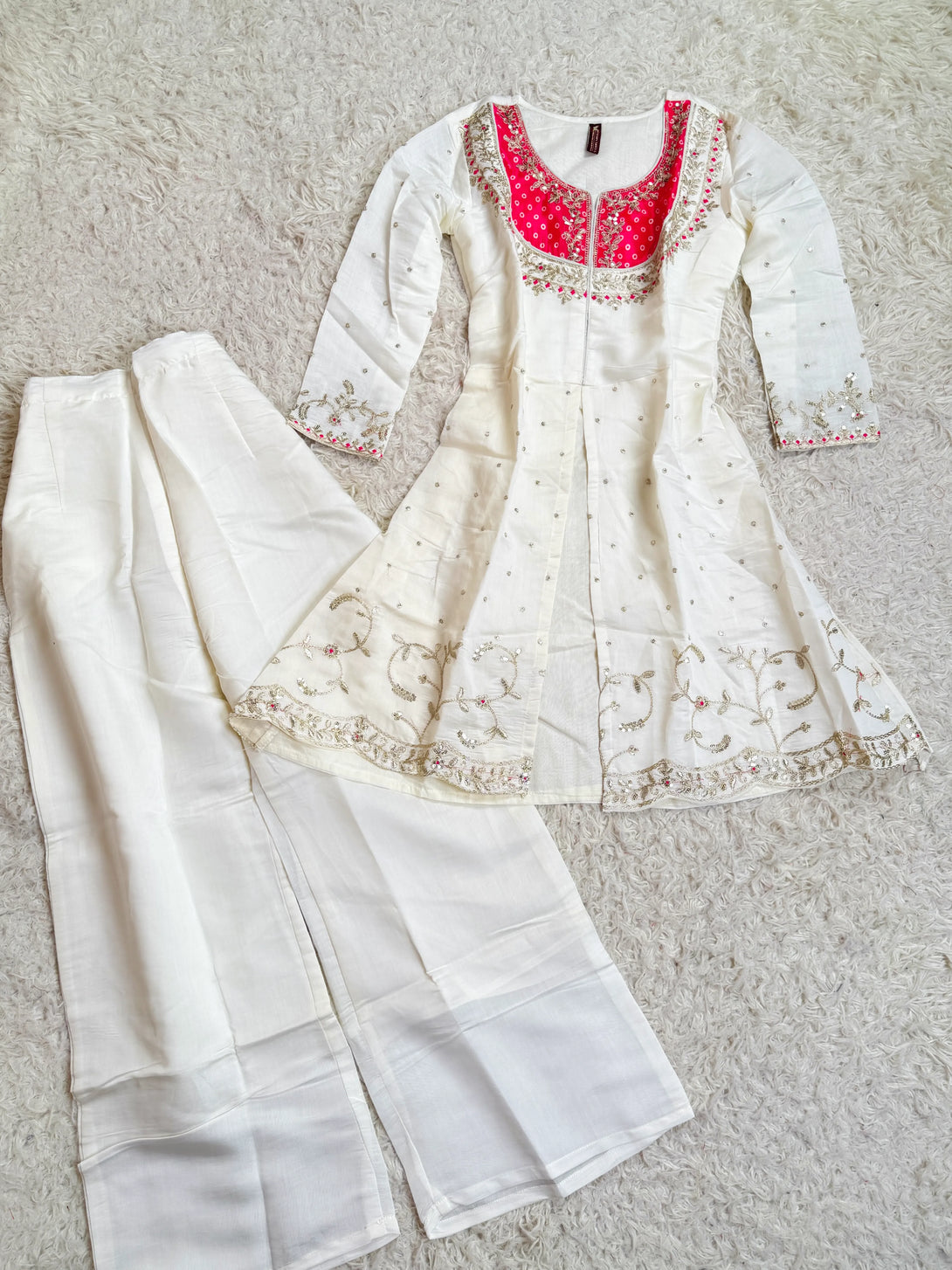 -Product Name: White Sequin-Embroidered Crepe-Silk fancy Palazzo-Kurti Set