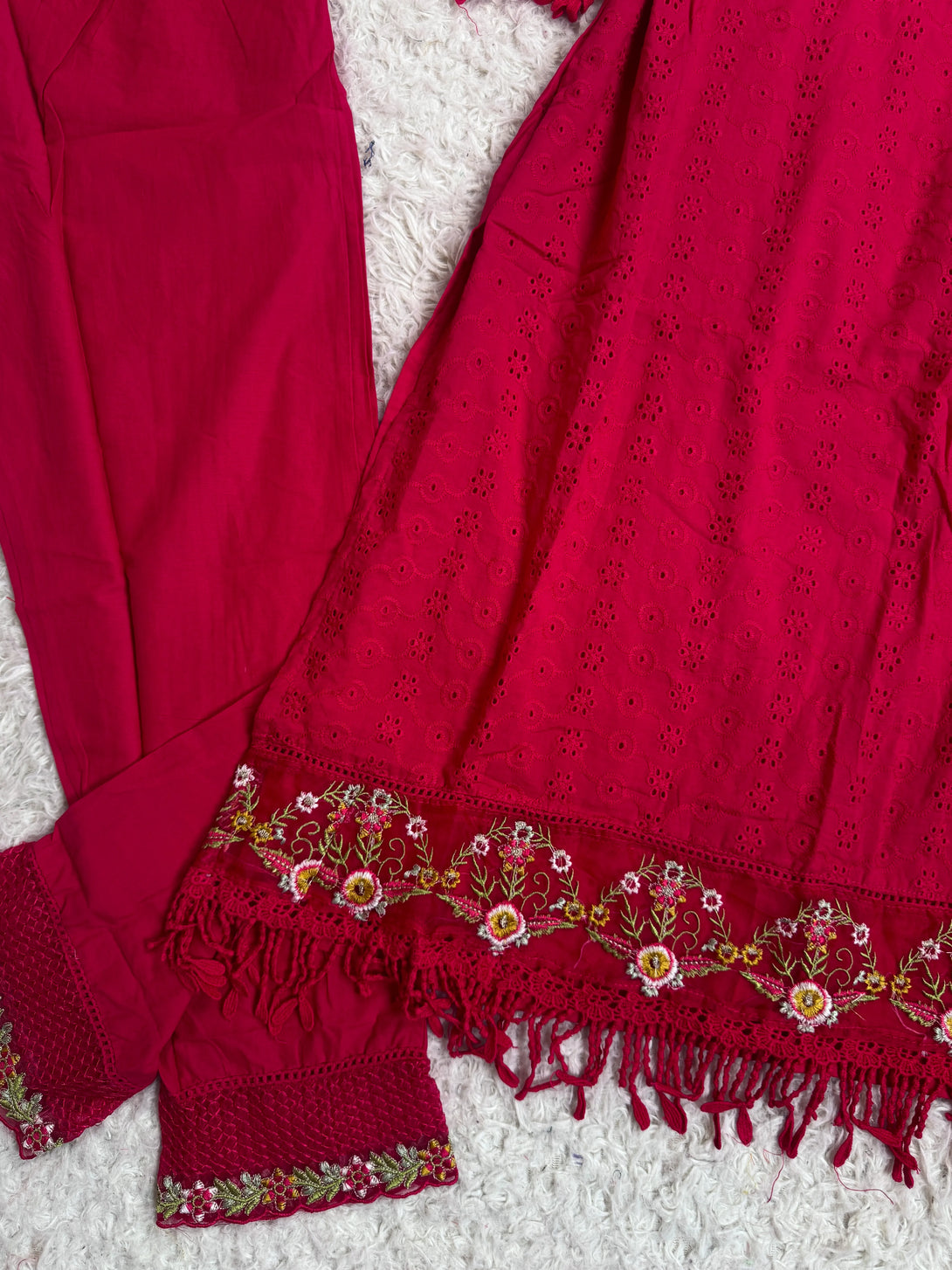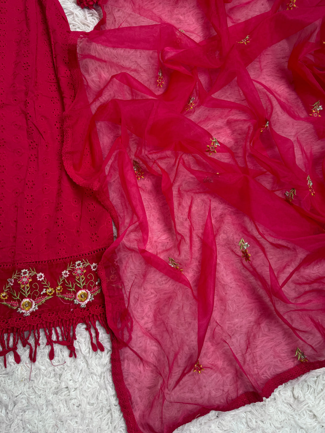 Rani-Pink Crochet-Luxurious-Embroidered Dupatta-Kurti-Pant-Set