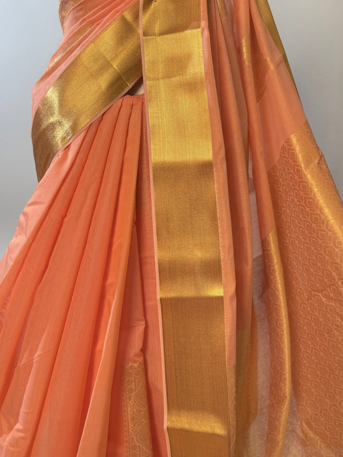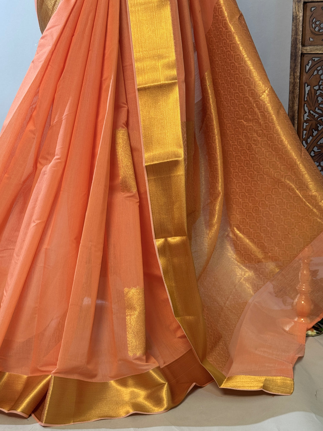 Pastel-Peach-Gold Silk-Cotton Woven-Square-Mandala South-Saree