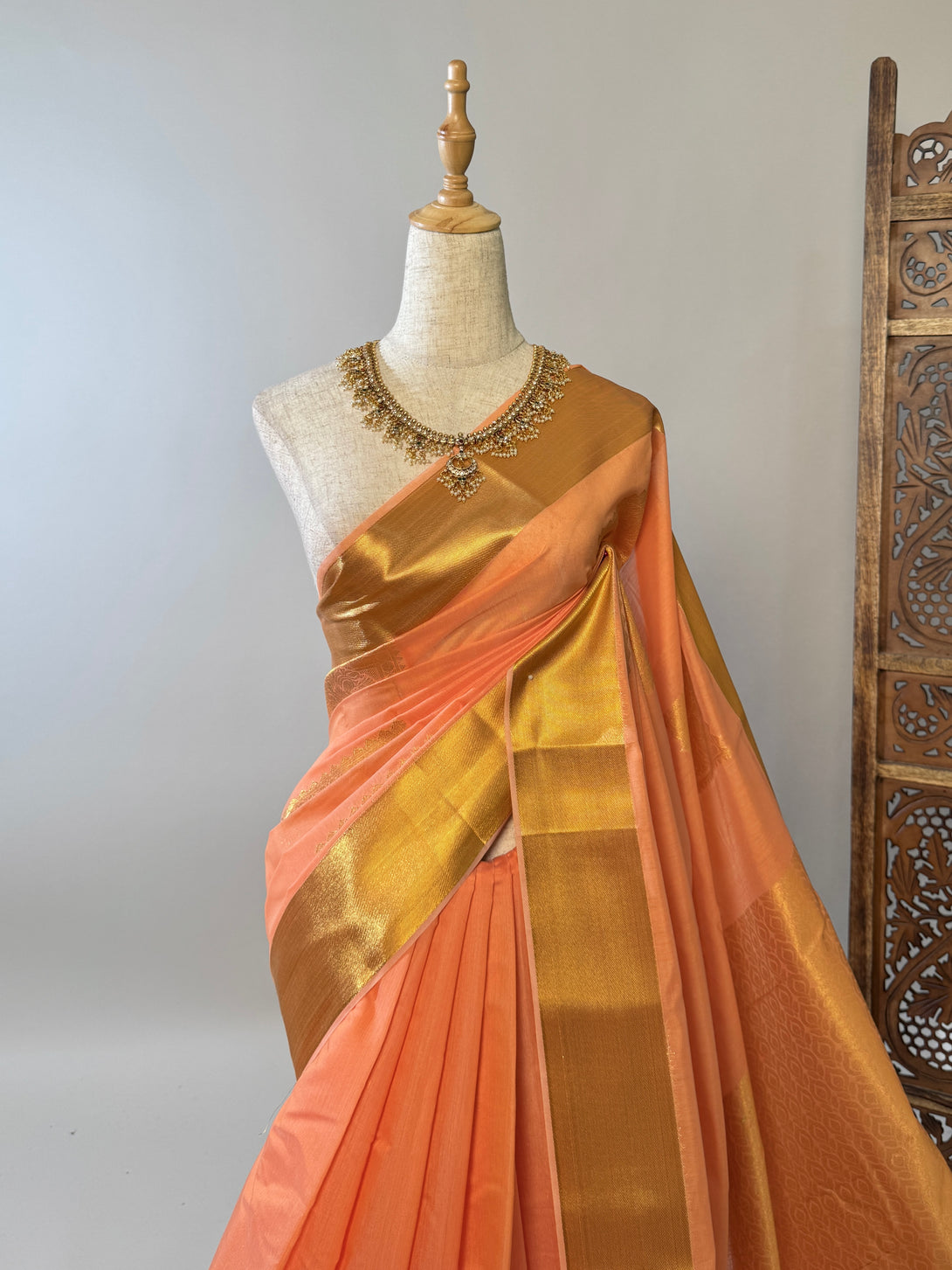 -Product Name: Pastel-Peach-Gold Silk-Cotton Woven-Square-Mandala South-Saree