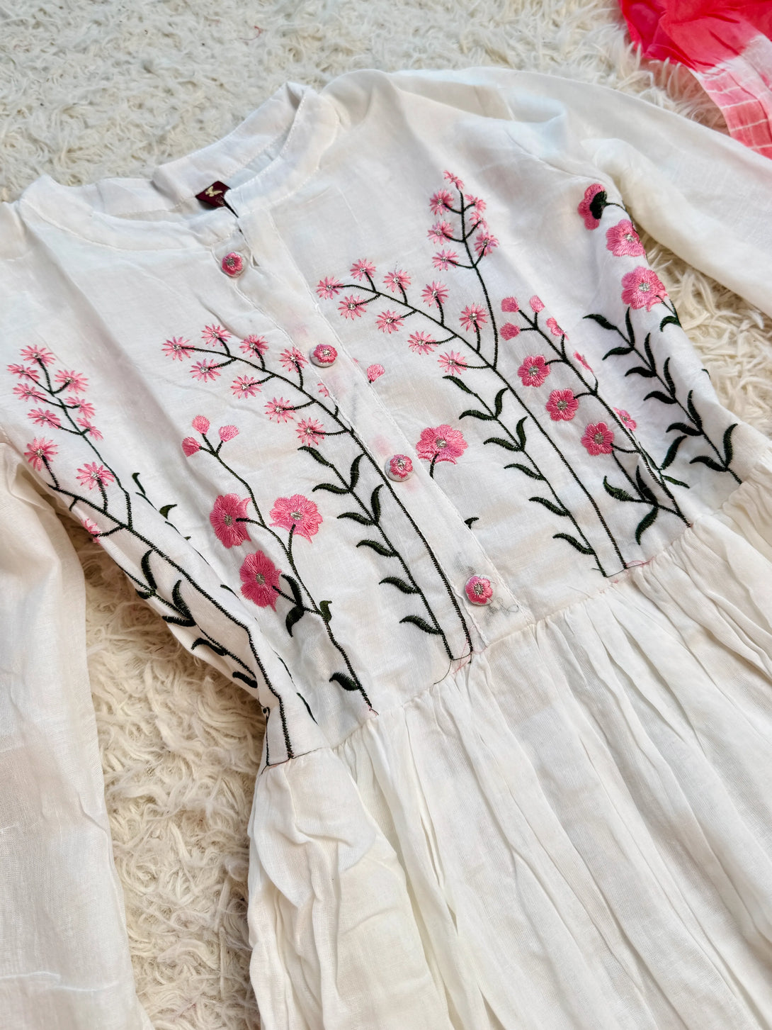 White Pure-Cotton Hand-Embroidery Flare Anarkali-Kurti-Pant-Dupatta-Set