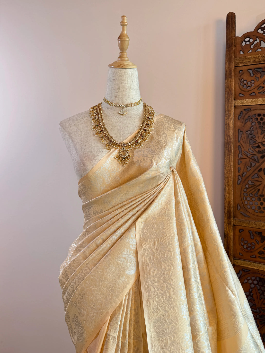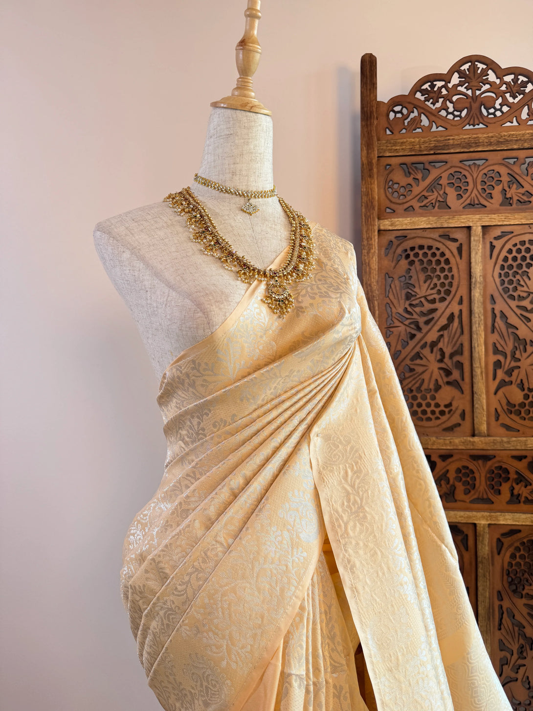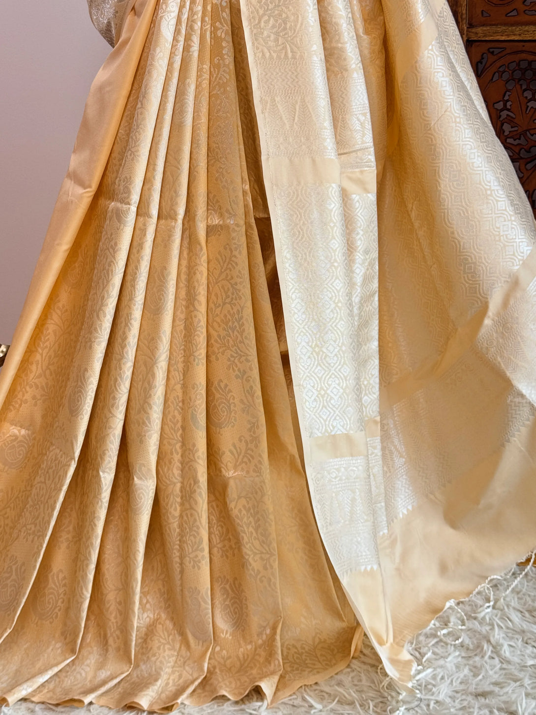 -Product Name: Pastel-Peach Soft-Silk Zari-Woven Borderless south saree