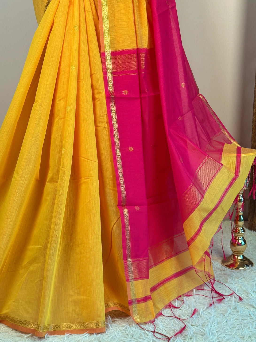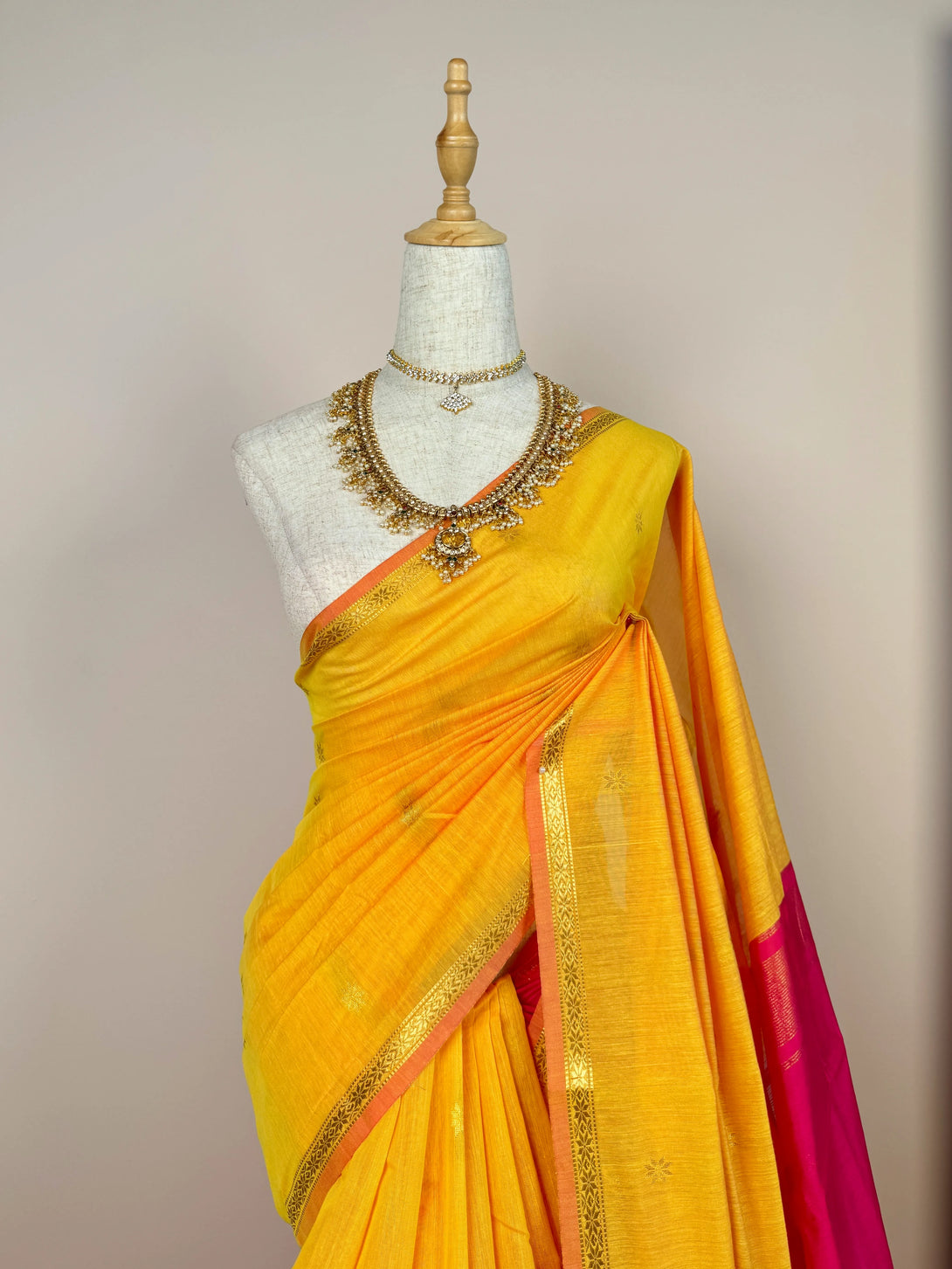 -Product Name: Mustard-Pink Silk-Cotton Woven-Butti South-Saree