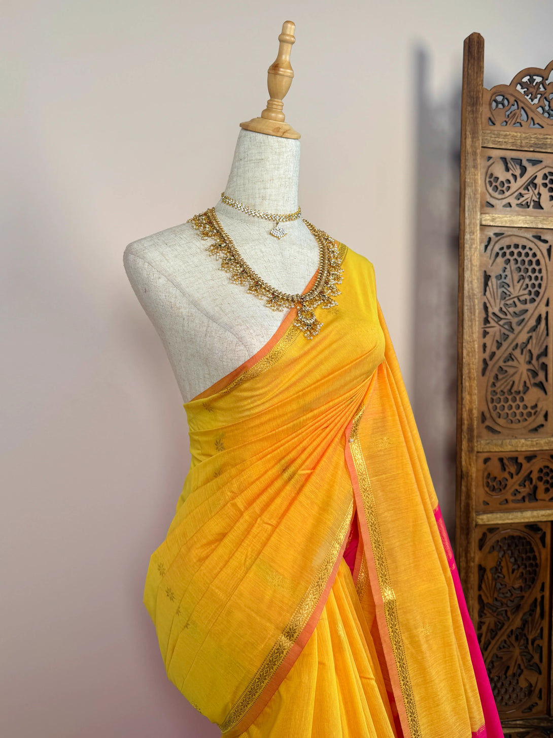 Mustard-Pink Silk-Cotton Woven-Butti South-Saree