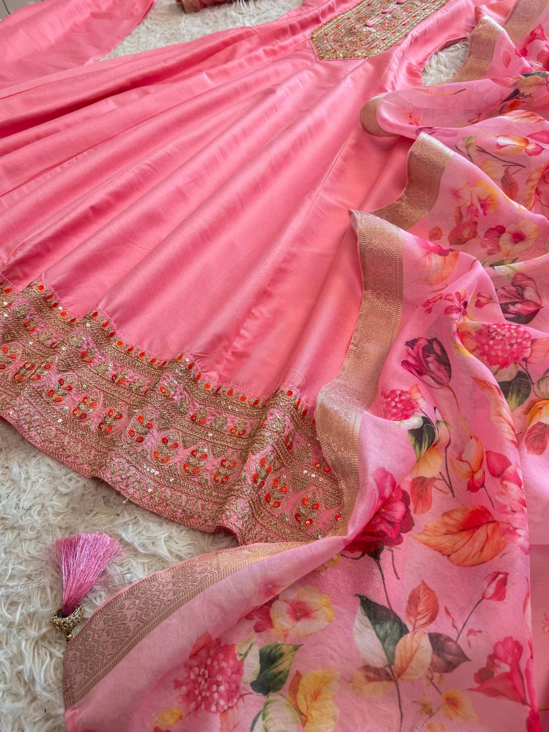 Soft-Pink Crepe-Silk Heavy-Embroidered Flare-Anarkali Floral-Dupatta-Kurti-Set