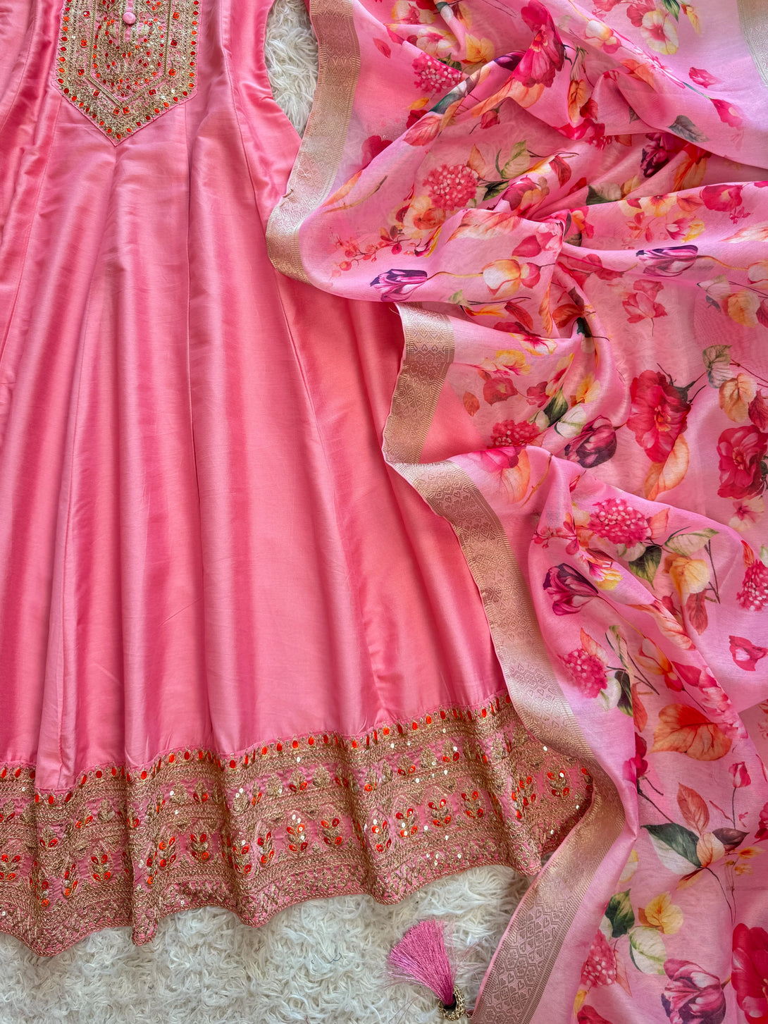 -Product Name: Soft-Pink Crepe-Silk Heavy-Embroidered Flare-Anarkali Floral-Dupatta-Kurti-Set