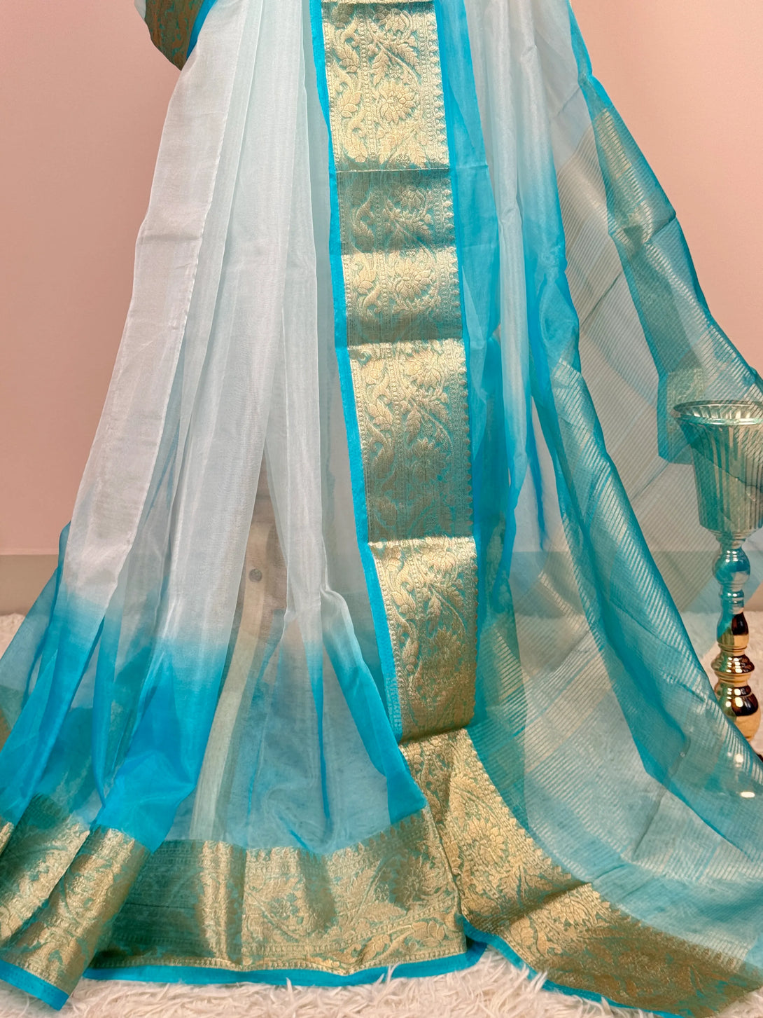 White-Sky blue Silken-Organza Woven-Border Hand-Dyed North-Saree
