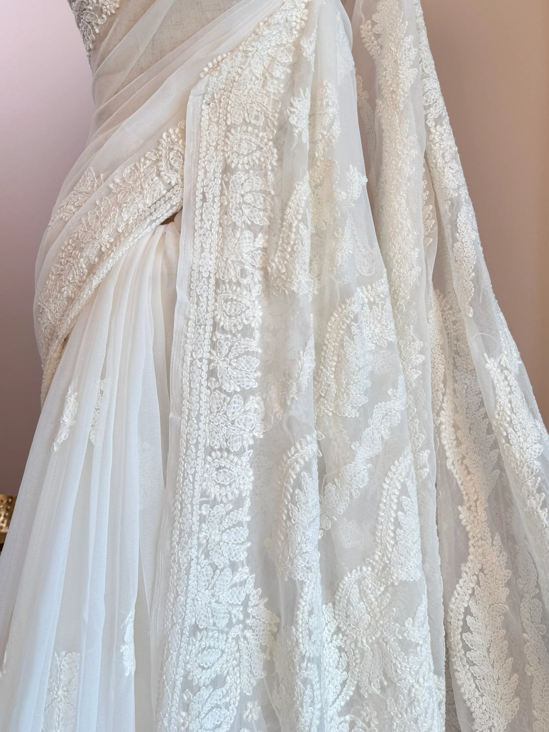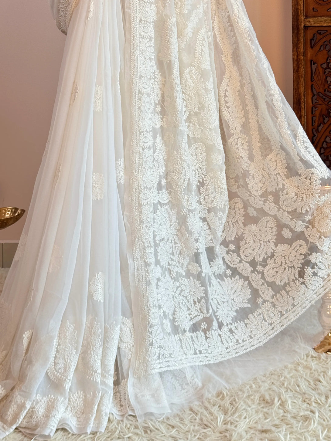 Pure-White Chiffon Chikan-Embroidered North Saree