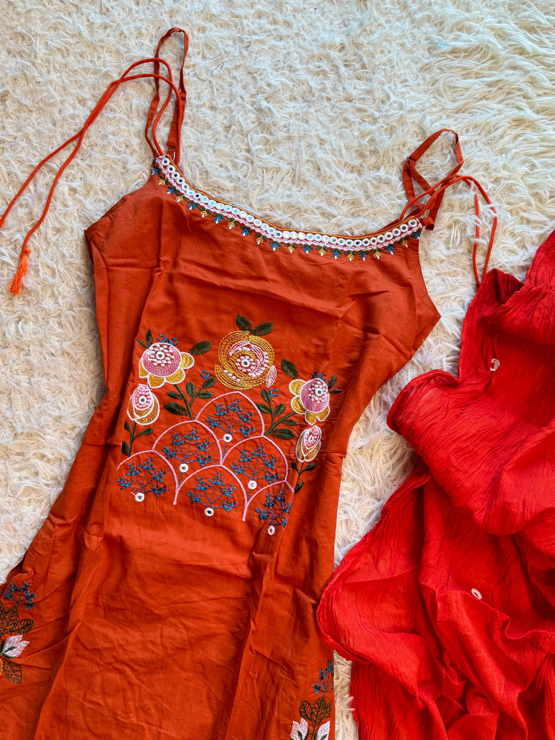 Orange Pure-Cotton Strappy-Casual Embroidered Kurti-Pant-Dupatta-Set
